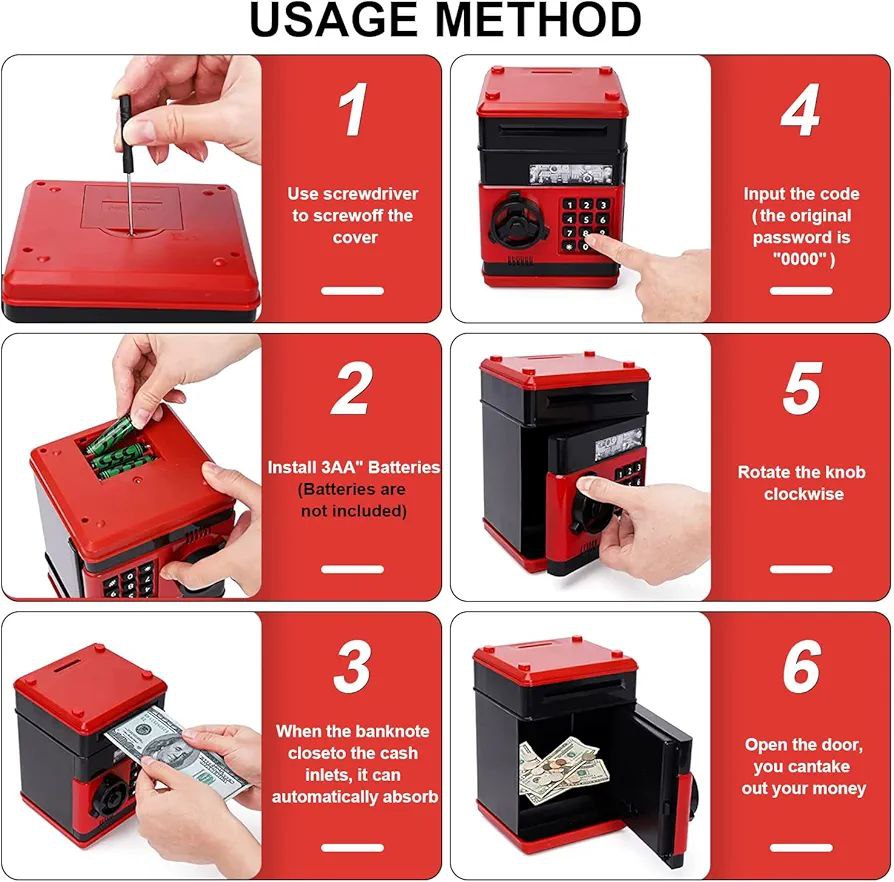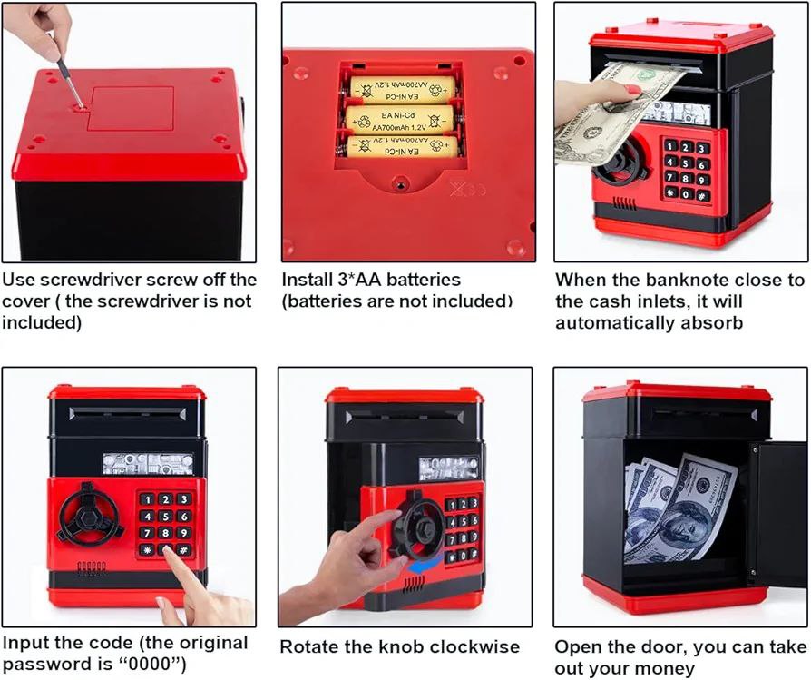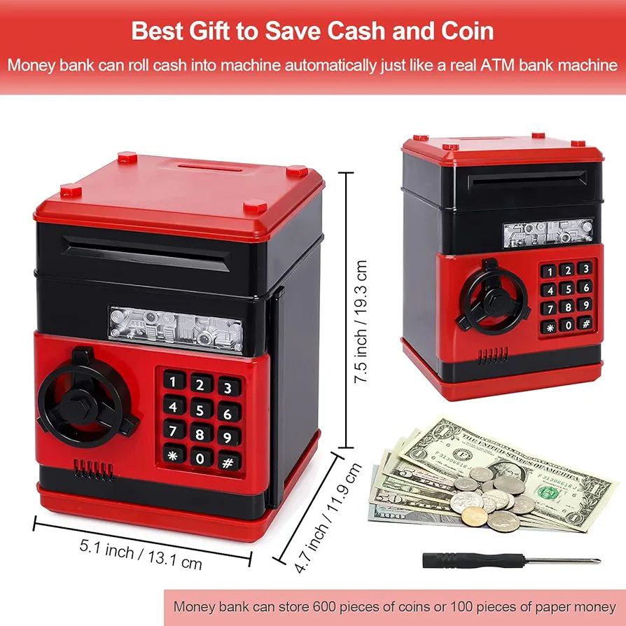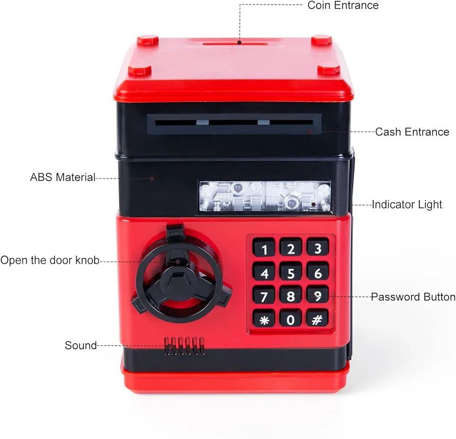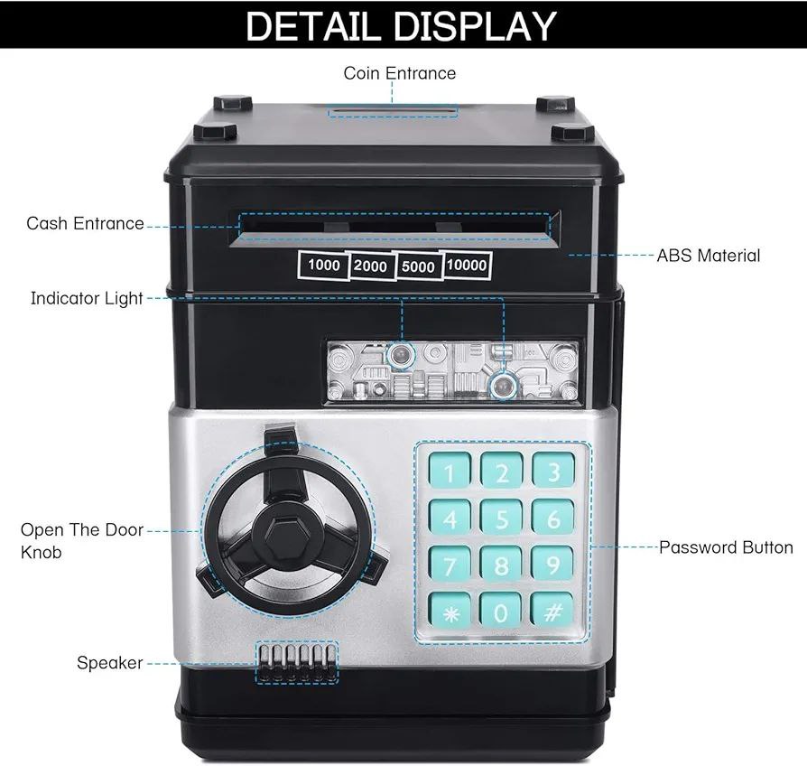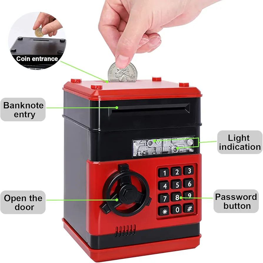 - Code PIN pour ouvrir la tirelire : Pour plus de sécurité et de contrôle.